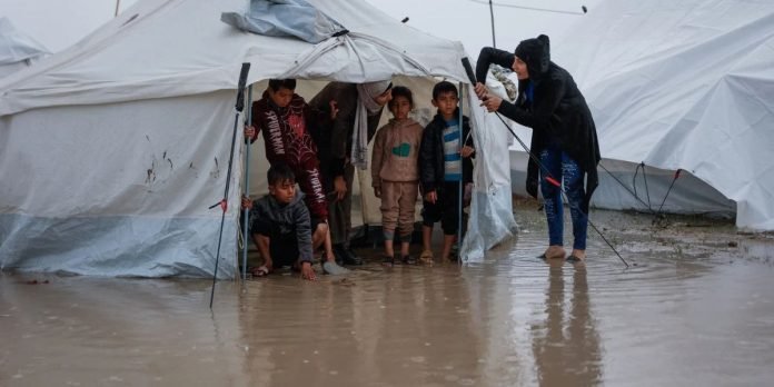 Young children, some barefoot and others wearing open sandals, trudged and hopped through ponds of muddy water as the rain continued to fall.”The mattress has been soaked since this morning, and the children slept in wet bedding last night,” Umm Muhammad Joudah told. “We don’t have any dry clothes to change into.”