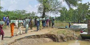 Villagers lead their cattle to higher ground after monsoon floods inundated parts of Sindh province, Pakistan. Photo courtesy: Reuters