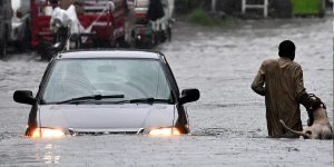 A man, accompanied by his dog, walks past a car through floodwaters during heavy monsoon rains in Rawalpindi, Pakistan, on July 17, 2025. [Aamir Qureshi/AFP]