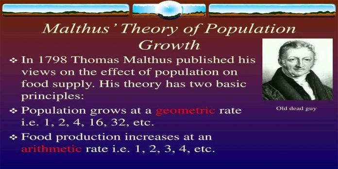 According to Malthus’s theory of population, human population grows in geometric (2,4,6,8,16). On the contrary the food supply, at most, increased arithmetically (1,2,3,4,5).
