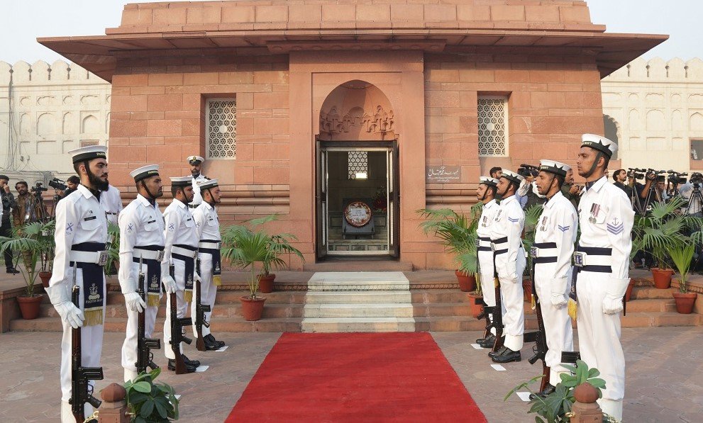 The ceremonial Guard mounting was followed by floral wreath-laying at the Mazar of National Poet by Station Commander (Navy) on behalf of Chief of the Naval Staff, Officers, Sailors and Civilians of Pakistan Navy.