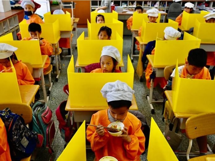 Recesses will be staggered and children will have to sit apart at the canteen, the teacher said, then asked students to respond to an online poll via their smartphones about how they felt about returning to school.